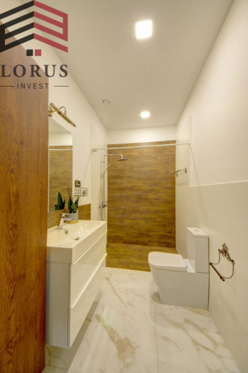 Pirmame aukšte – didžiulė svetainė (40 kv. m) su panoraminiais langais ir išėjimu į terasą su vaizdu į ežerą, atskira virtuvė su visa buitine technika, du vonios kambariai (su skalbykle ir džiovykle), bei patalpa sandėliavimui.