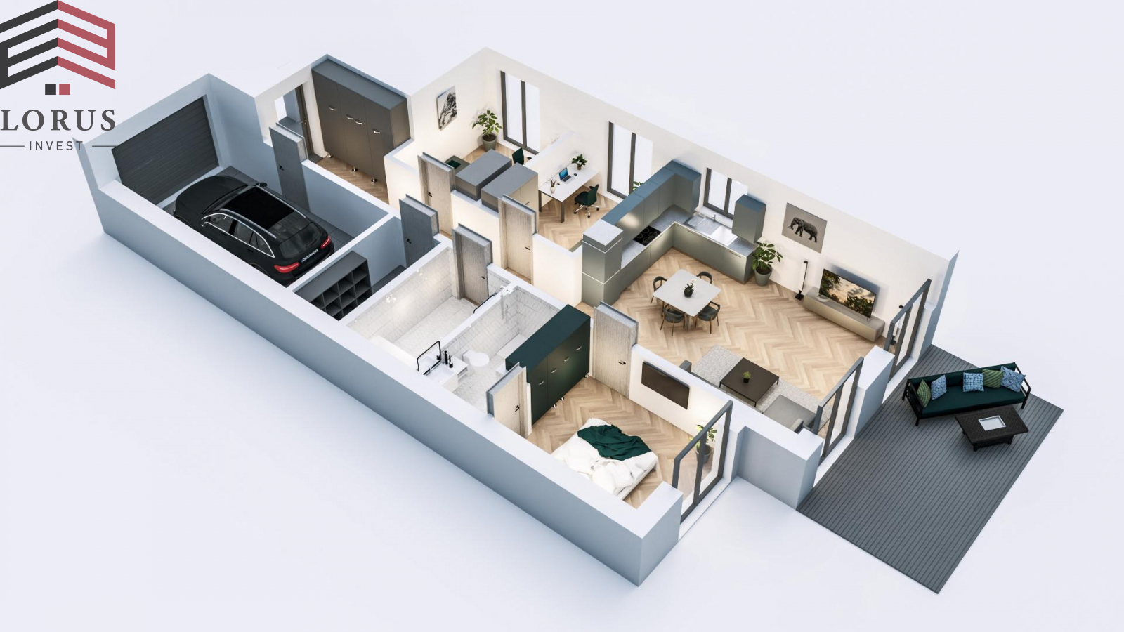 • Funkcionalus suplanavimas viename aukšte: 3 miegamieji, 2 vonios kambariai, drabužinės, (tėvų miegamasis su nuosavu vonios kambariu ir drabužine);