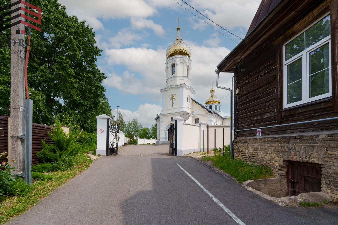 -- Vaizdas pro langą į cerkvę, tolumoje matyti Trijų Kryžių kalnas – autentiška, jauki aplinka.