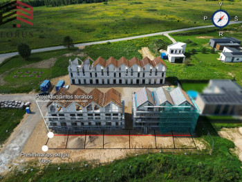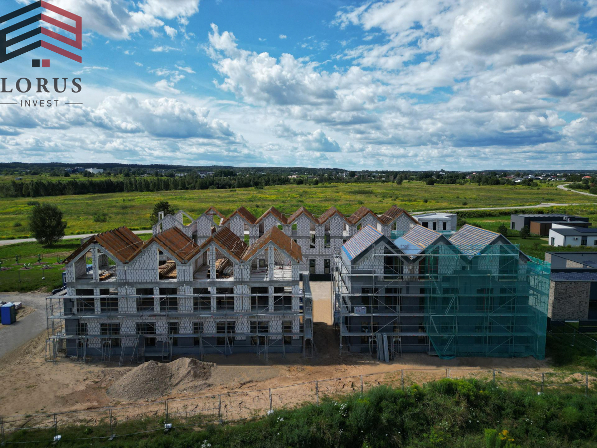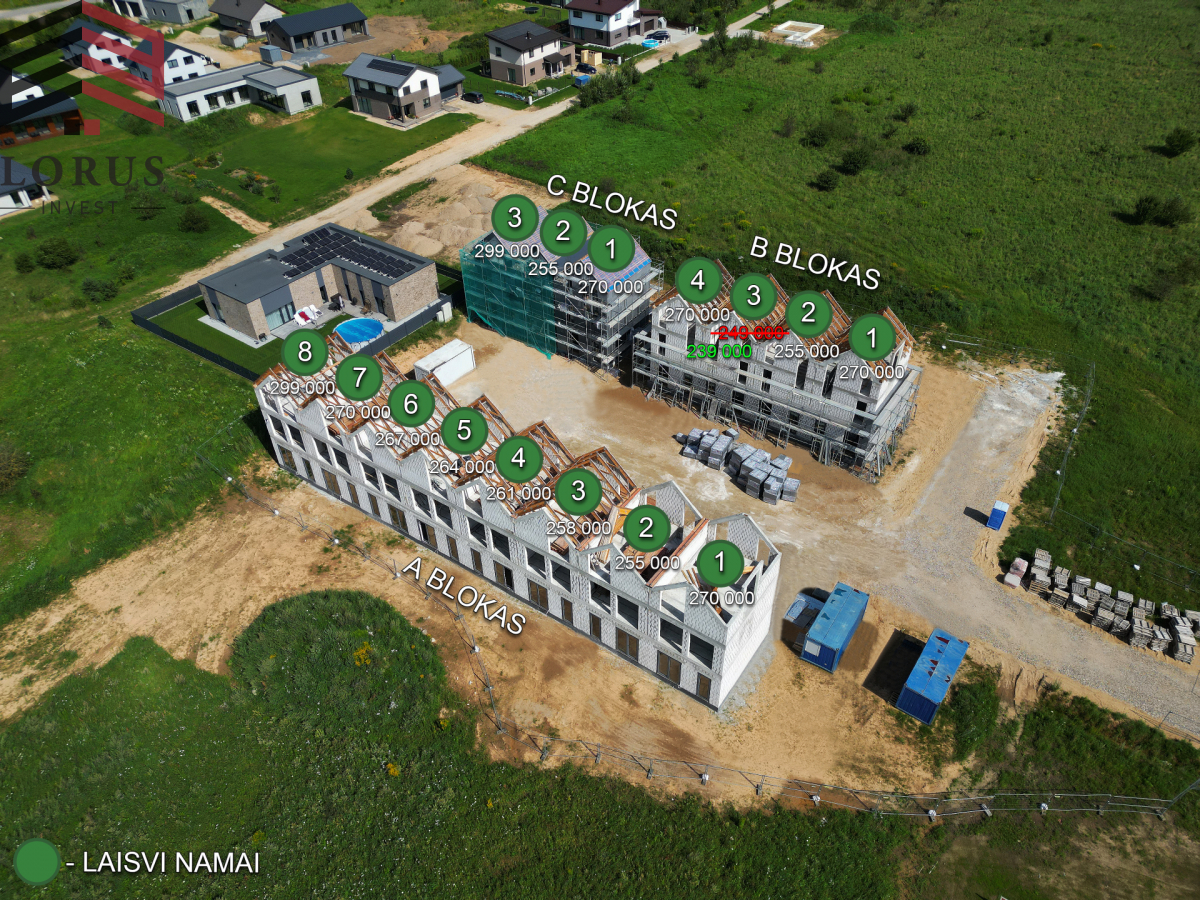 Namai parduodami su daline vidaus apdaila ir pilnai įrengtu lauku. Įrengtos elektros, santechnikos, nuotekų sistemos, išbetonuotos visų aukštų grindys su įrengta grindinio šildymo sistema, sumontuotos pertvarinės sienos, apšildytos lubos. Sutvarkyta - išasfaltuota, aptverta ir apšviesta teritorija, suformuotos automobilių parkavimo vietos, nutiestas pėsčiųjų takas.