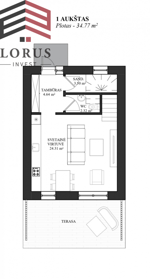 ◾Svetainė kartu su virtuve - 24,31 kv. m.;