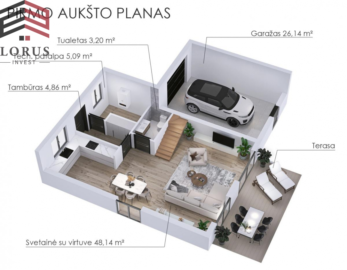 Viduje privatu ir šviesu, didelis dėmesys skirtas svetainei, besijungiančiai su valgomojo, virtuvės zona ir išėjimu į terasą. Namuose suplanuoti 3 miegamieji, 2 vonios kambariai, tualetas pirmame aukšte ir garažas.