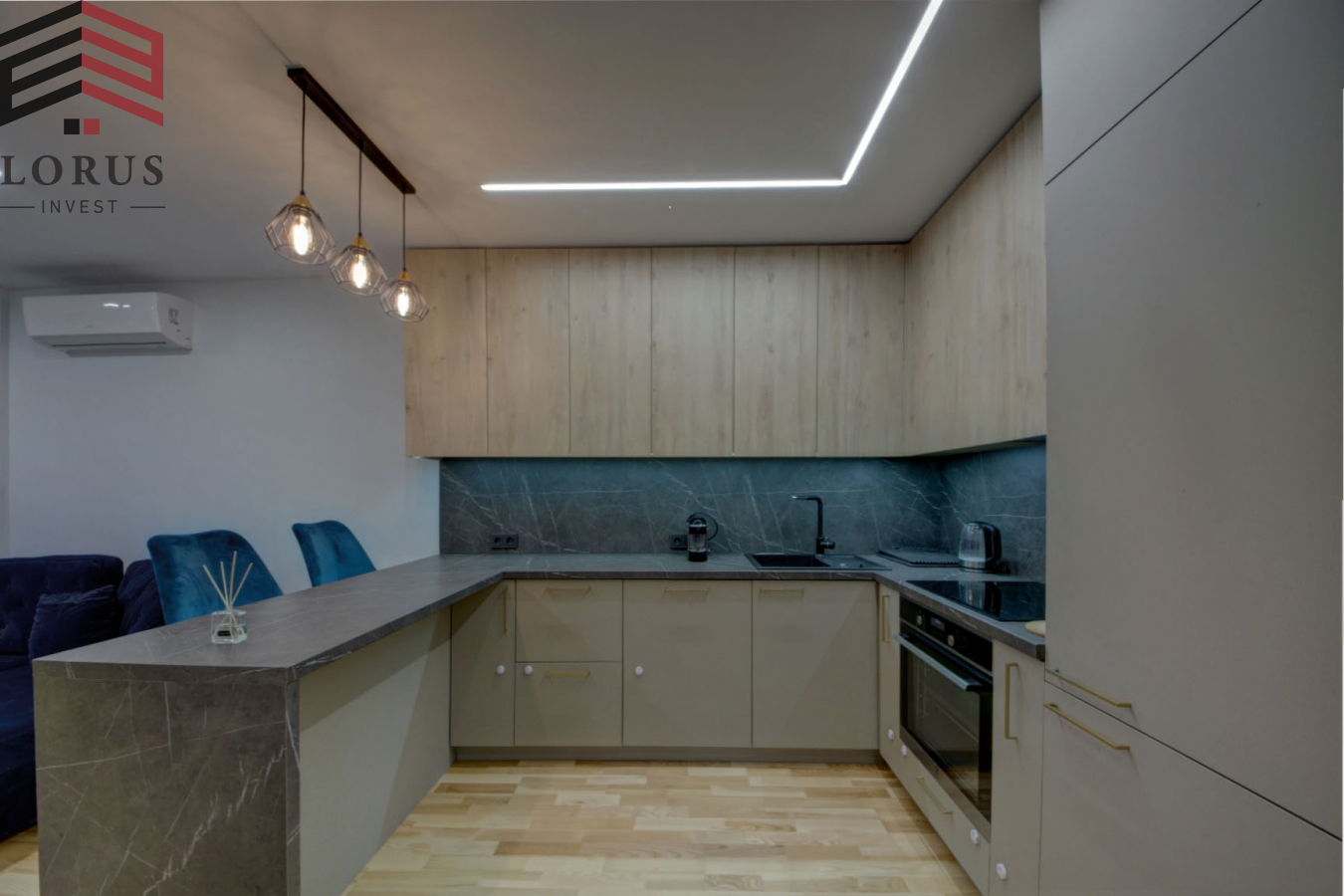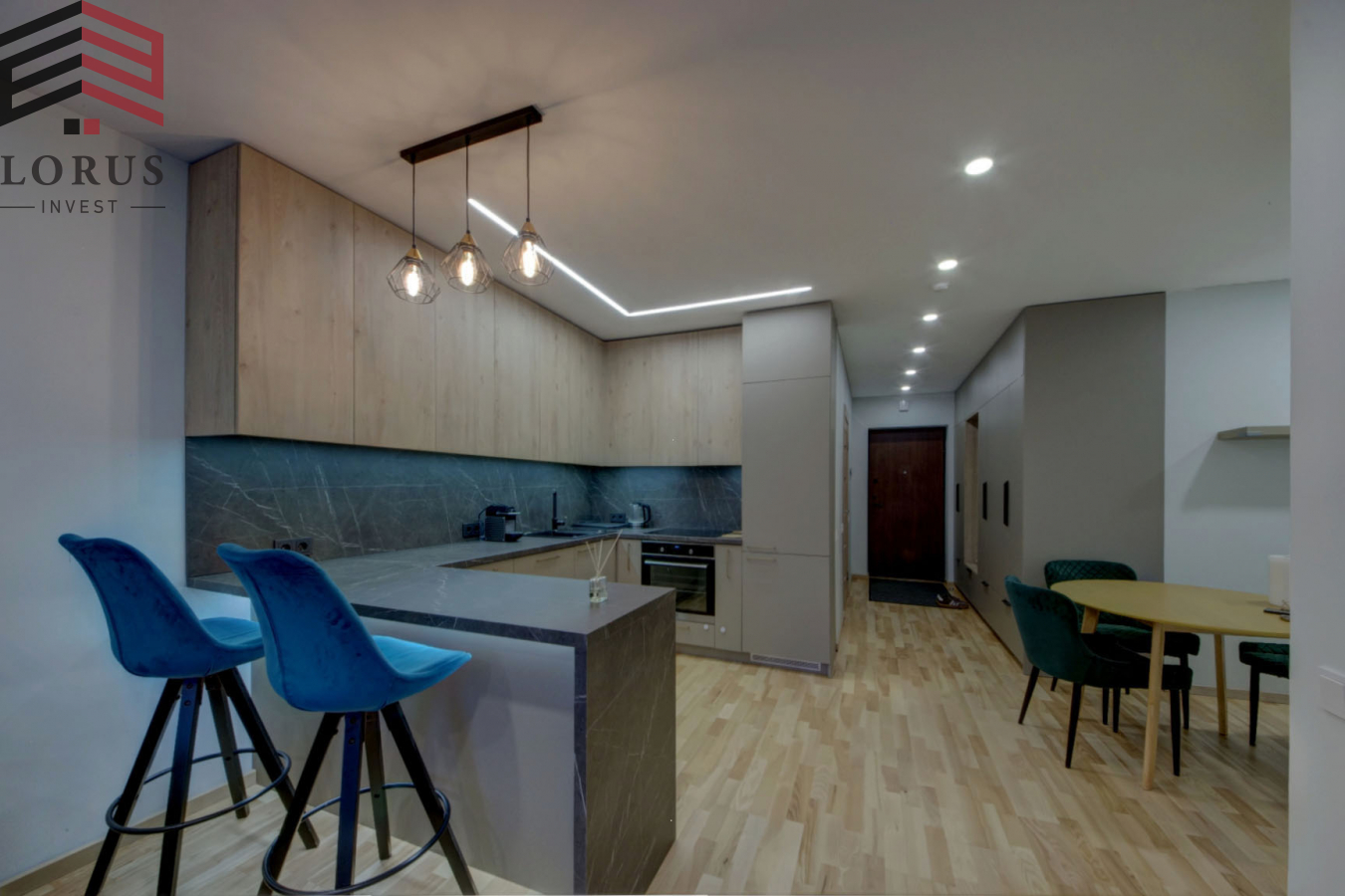 Svetainė su virtuve, darbo zona ir prieškambariu – 37 kv. m